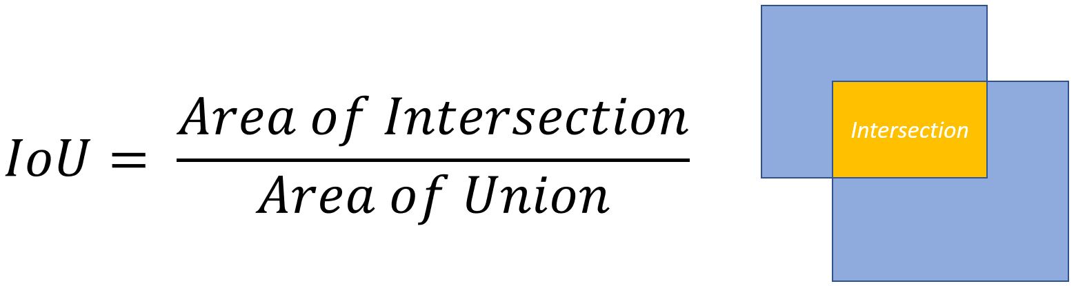 Dazu wird typischerweise eine Metrik namens Intersection-over-Union (IoU) verwendet. Im folgenden Beispiel wird die IoU durch Division der gelben Fläche durch die Summe der gelben und blauen Flächen angegeben. Eine IoU von 1,0 entspricht einer perfekten Übereinstimmung, während eine IoU von 0 anzeigt, dass sich die beiden Rechtecke nicht überlappen. Typischerweise wird eine IoU von 0,5 als gute Lokalisierung betrachtet. Siehe auch diese Seite für eine eingehendere Diskussion.