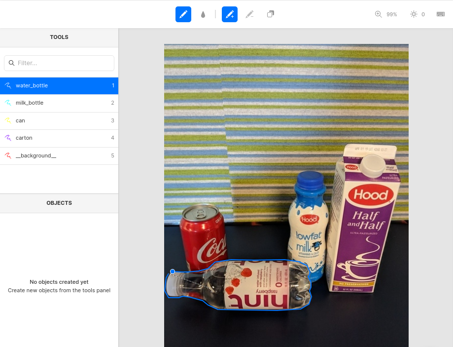 Für die Masken- (Segmentierungs-) Annotation ist ein einfach zu bedienendes Online-Tool Labelbox, wie in der folgenden Abbildung gezeigt. Sehen Sie sich die Demo Introducing Image Segmentation at Labelbox an, wie das Tool verwendet wird, und das Notebook 02_mask_rcnn, wie die Labelbox-Annotationen in das Pascal-VOC-Format konvertiert werden. Alternativen zu Labelbox sind CVAT oder RectLabel (nur Mac).