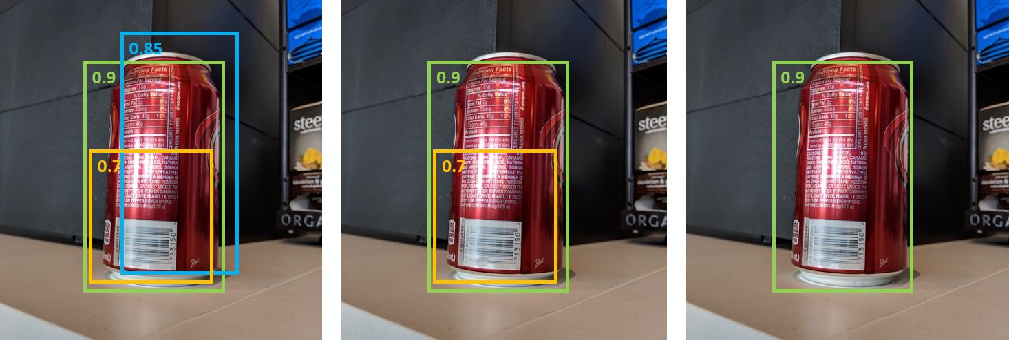 Erkennungsergebnisse mit Konfidenzwerten vor (links) und nach Non-Maxima Suppression mit IOU-Schwellenwerten von (Mitte) 0,8 und (rechts) 0,5.