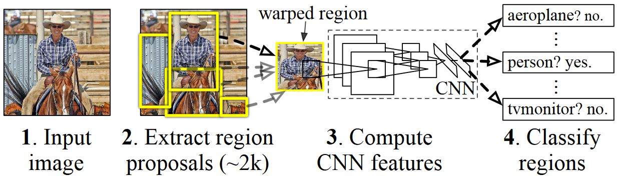 Ähnlich wie die meisten Methoden zur Objekterkennung verwenden R-CNNs ein tiefes neuronales Netz, das für die Bildklassifizierung mit Millionen von annotierten Bildern trainiert wurde, und modifizieren es für den Zweck der Objekterkennung. Die Grundidee des ersten R-CNN-Papiers ist in der folgenden Abbildung (aus dem Papier übernommen) dargestellt.