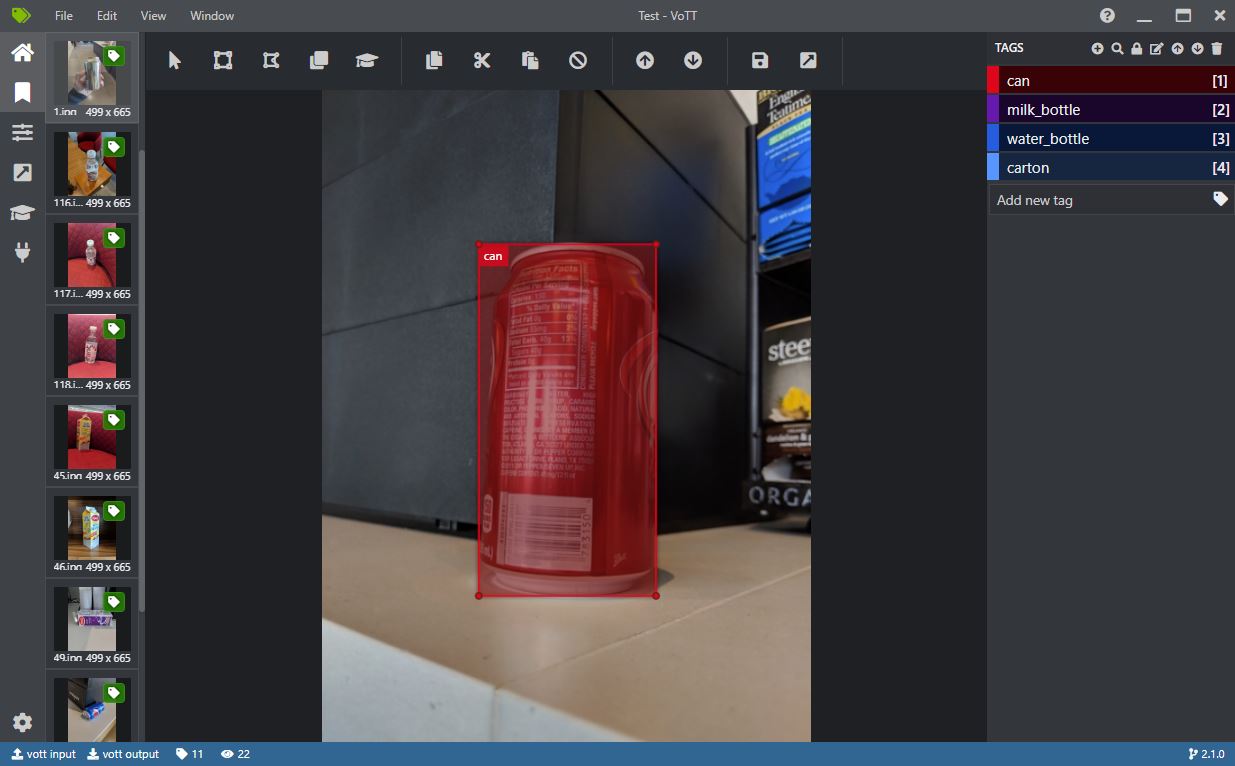 VOTT kann verwendet werden, um manuell Rechtecke um ein oder mehrere Objekte in einem Bild zu zeichnen. Diese Annotationen können dann im Pascal-VOC-Format (eine XML-Datei pro Bild) exportiert werden, das die bereitgestellten Notebooks lesen können.