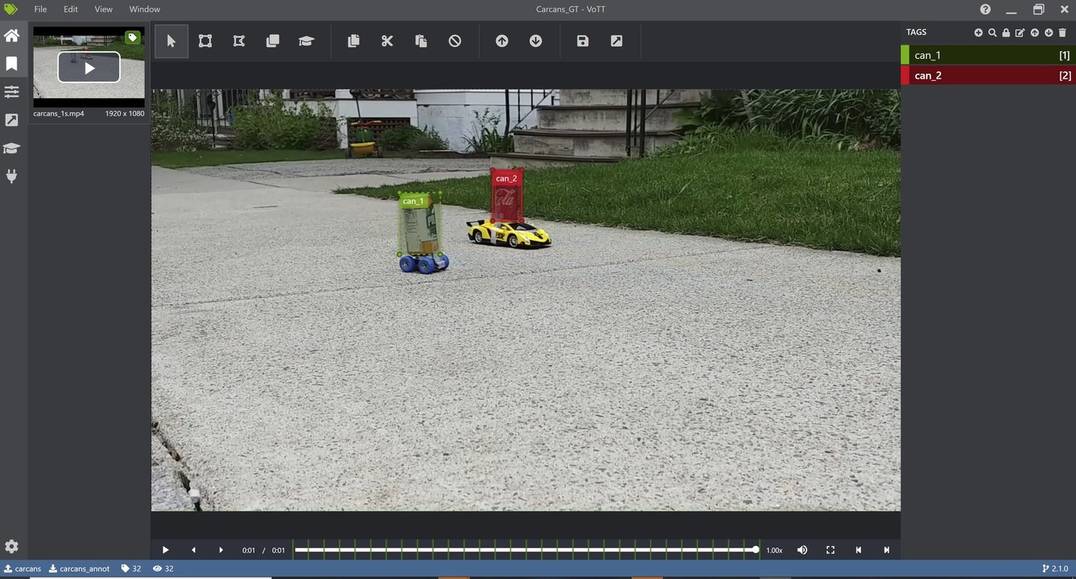 Siehe unten ein Beispiel, in dem wir VOTT verwenden, um die beiden Dosen im Bild als can_1 und can_2 zu annotieren, wobei sich can_1 auf die weiß/gelbe Dose und can_2 auf die rote Dose bezieht. Vor der Annotation ist es wichtig, die Extraktionsrate korrekt einzustellen, um der des Videos zu entsprechen. Nach der Annotation können Sie die Annotationsergebnisse in verschiedenen Formen exportieren, z.B. als PASCAL VOC oder .csv-Format. Für das .csv-Format würde VOTT die extrahierten Frames sowie eine CSV-Datei mit den Bounding-Box- und ID-Informationen zurückgeben.
