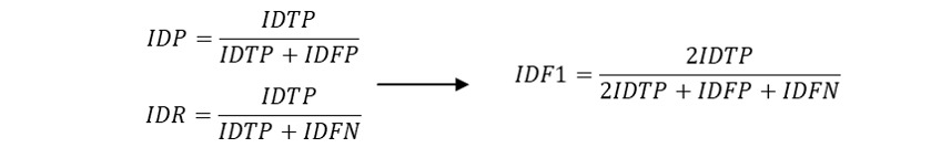 - IDF1 misst die Gesamtleistung mit einer ID-basierten Berechnung, wie lange der Tracker das Ziel korrekt identifiziert. Es ist das harmonische Mittel aus Identifikationspräzision (IDP) und Recall (IDR).