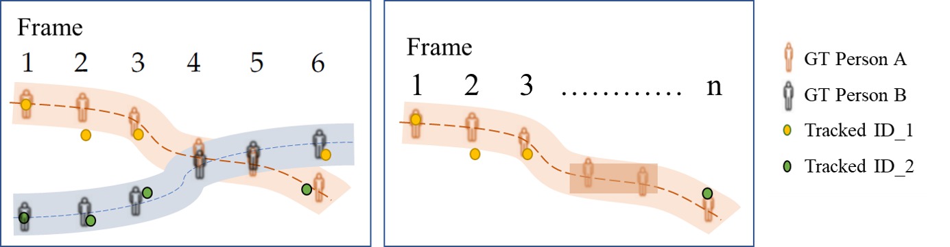- ID-switch misst, wenn der Tracker fälschlicherweise die ID einer Trajektorie ändert. Dies wird in der folgenden Abbildung veranschaulicht: in der linken Box überlappen sich Person A und Person B und werden in den Frames 4-5 nicht erkannt und verfolgt. Dies führt zu einem ID-Switch in Frame 6, wo Person A die ID_2 zugewiesen wird, die zuvor als Person B markiert war. In einem anderen Beispiel in der rechten Box verliert der Tracker die Spur von Person A (anfangs als ID_1 identifiziert) nach Frame 3 und identifiziert diese Person schließlich mit einer neuen ID (ID_2) in Frame n, was eine weitere Instanz eines ID-Switches zeigt.