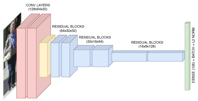 Während ältere Algorithmen lokale Merkmale wie optischen Fluss oder regionale Merkmale (z.B. Farbhistogramme, gradientenbasierte Merkmale oder Kovarianzmatrix) verwendeten, verwenden neuere Algorithmen auf Deep Learning basierende Merkmalsextraktionen. Die gängigsten Deep-Learning-Ansätze, die typischerweise auf Re-ID-Datensätzen trainiert werden, verwenden klassische CNNs zur Extraktion visueller Merkmale. Ein solcher Datensatz ist der MARS-Datensatz. Die folgende Abbildung zeigt ein Beispiel für ein CNN, das vom DeepSORT-Tracker für MOT verwendet wird: <p align="center">