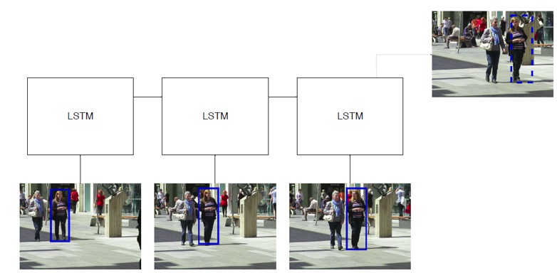 In einem LSTM-Netzwerk werden extrahierte Merkmale aus verschiedenen Detektionen in verschiedenen Zeit-Frames als Eingaben verwendet. Das Netzwerk prognostiziert die Bounding Box für den nächsten Frame basierend auf der Eingabe-Historie. <p align="center">