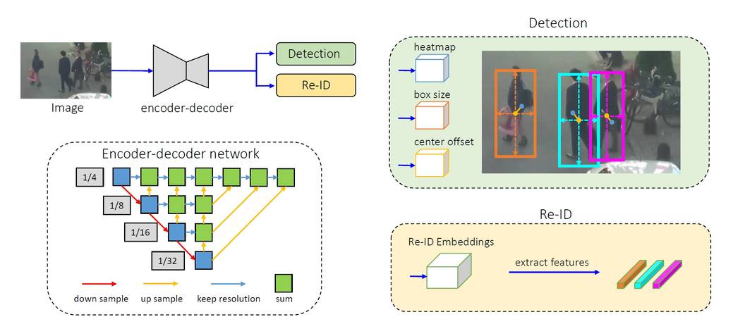 Er besteht aus einem einzigen Encoder-Decoder-Neuronalen Netz, das hochauflösende Feature-Maps des Bild-Frames extrahiert. Als One-Shot-Tracker speist er zwei parallele Köpfe für die Vorhersage von Bounding Boxes und Re-ID-Features, siehe Quelle.